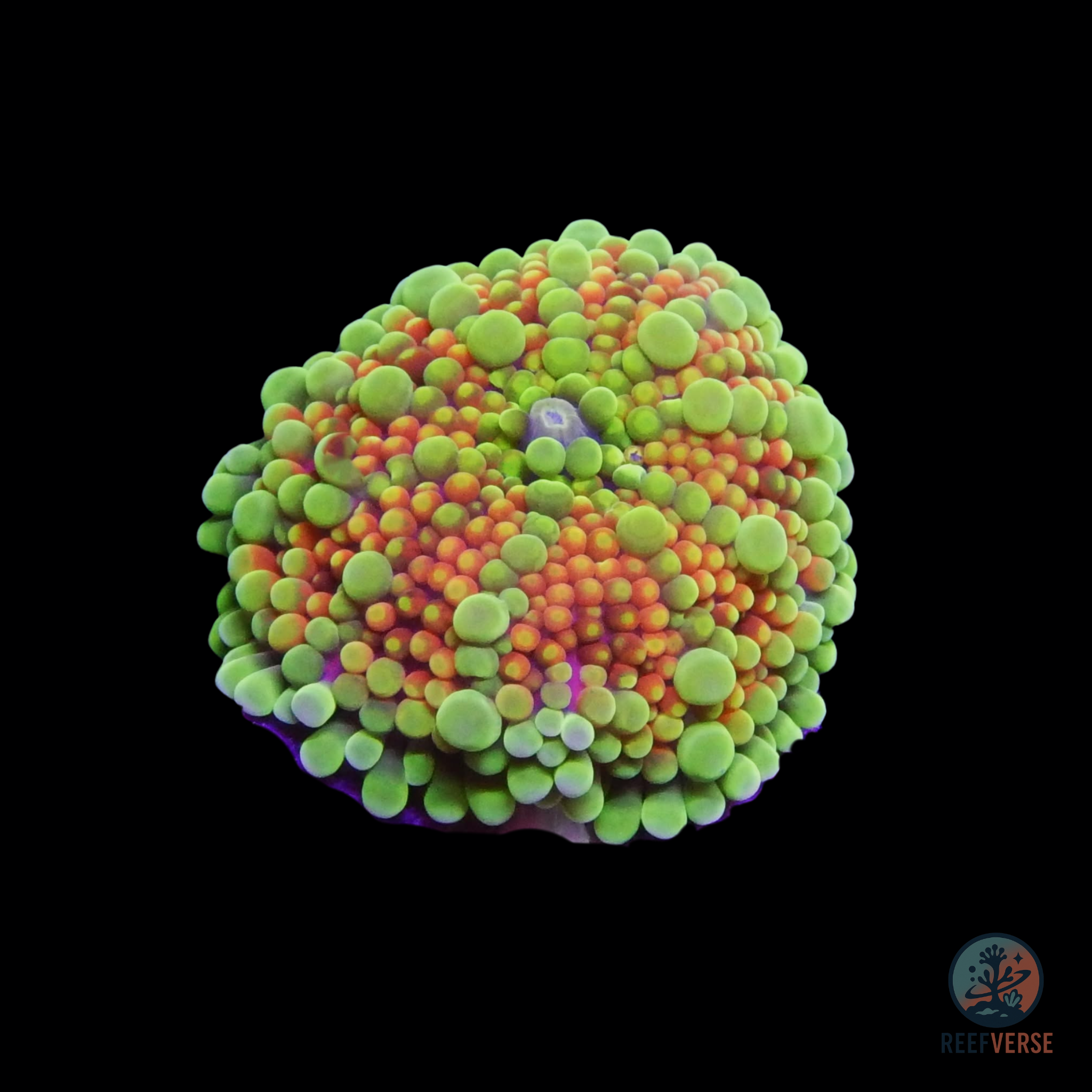 The Gamma Burst Bounce Yuma radiates raw cosmic energy — a living explosion of glowing neon green, fiery orange, and ultraviolet undertones. Each inflated vesicle pulses like charged plasma, creating the look of a miniature supernova frozen in motion. Under reef lighting, its color intensity surges to life, igniting your tank with pure gamma energy.