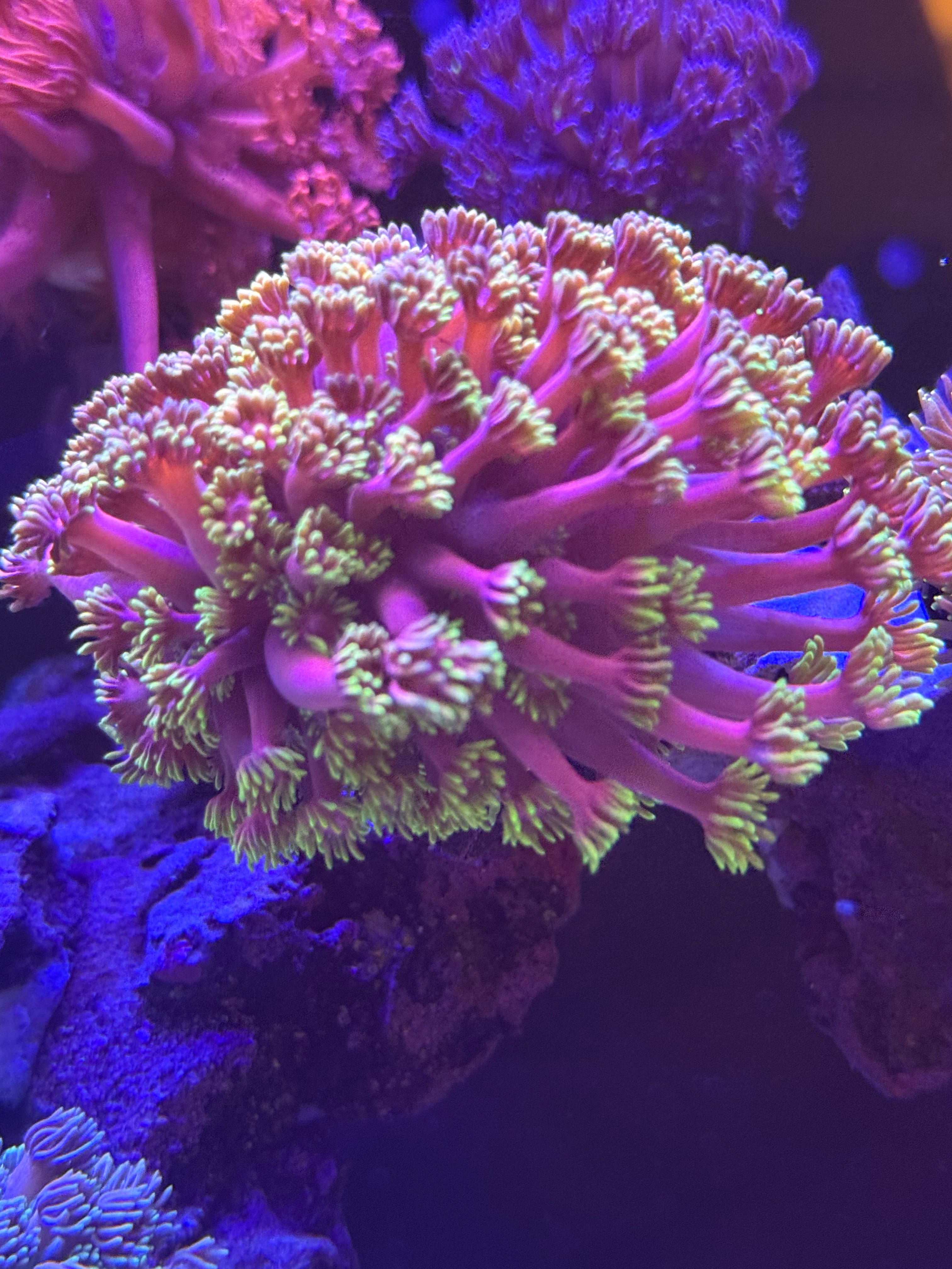 The Hollywood Nights Goniopora (GalaxSea Grails Exclusive) shines like a reef-side spotlight, displaying deep metallic purples with vibrant yellow tips that glow under reef lighting. Its long, flowing polyps sway gracefully in the current, adding constant motion and color to your aquarium.